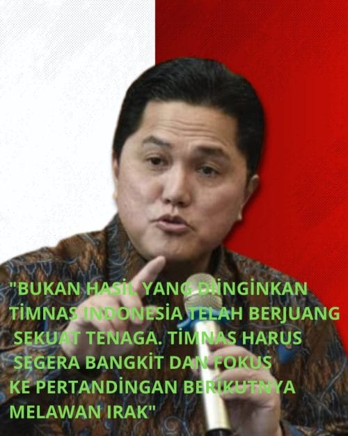 Erick Thohir berharap skuad Garuda segera melupakan hasil ini dan menatap laga melawan Irak dengan motivasi baru. Pertandingan tersebut akan menjadi penentu penting dalam perjalanan Timnas Indonesia di Grup B Kualifikasi Piala Dunia 2026 Zona Asia.